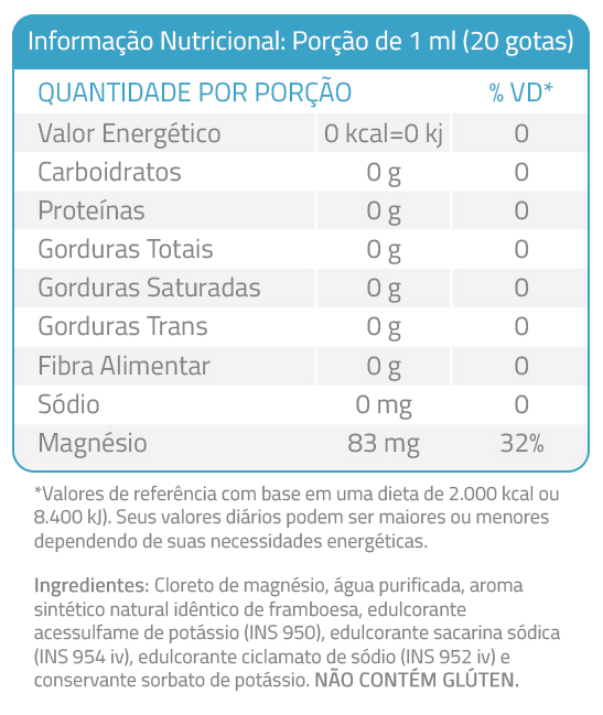 O cloreto de magnésio não é medicamento, mas um suplemento mineral essencial para a saúde humana. Consuma este produto conforme a Recomendação de Ingestão Diária IDR (RDC n° 269 de 22 de setembro de 2005*). Pacientes portadores de doença renal e doenças cardíacas, bem como gestantes, lactantes e crianças, somente devem consumir este produto sob orientação de um médico ou nutricionista.